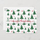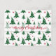 This fun, whimsical design is a repeating pattern of quirky green Christmas trees that seem to dance across the surface. They're topped with wee yellow stars and interspersed with red snowflakes. The words "Merry Christmas" appear over an opaque white strip in red, rendered in a unique script font. This layer is an overlay graphic. Use the template fields to add your return address to the back. Please don't hesitate to reach out for any customization assistance or special requests.