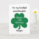 A personalized 13th birthday St. Patrick's Day card featuring a cloverleaf on the front. You will be able to easily personalize the front with the birthday recipient's details. The inside card message can also be personalized. This personalized St. Patrick's Day birthday card would make a unique card keepsake for your granddaughter, grandson and more.