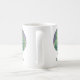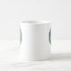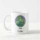 Easily personalized text is featured on this coffee mug that is embellished on either side with a circular pastel artwork depicting three leaved clover or shamrocks in soft green on a muted purple background. The shamrock is a motif perfect for St. Patrick’s Day.