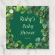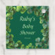 Green clovers painted around a green background. The text is white with green outline and a lighter green shadow as a fully customizable for a baby shower for a mother to be.