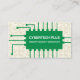 A simplified and diagrammatic computer chip is superimposed on a circuit board background on this business card for a high tech company.