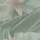 Glamourous green and cream silk or satin textile drapery background with flowing folds and bouquets of pink and white flowers around a diamond-shaped golden frame.