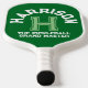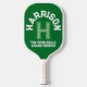 Personalized pickleball paddle with your name and family name initial and team or slogan in white, green and dark green, one side has background in dark green the other in mid green. Reads Harrison H The pickleball grand master. Personalize this bold sports style paddle with your own name and initial and team name or add a slogan. Designed by www.mylittleeden.com on zazzle.