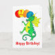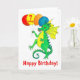 A colourful birthday card for a 7 year old with a green and yellow dragon, carrying balloons, from a watercolour painting by Judy Adamson. The greeting on the front is 'Happy Birthday' in red lettering and the inside is left blank for your own message.