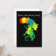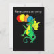 A colourful invitation card for a kids' party with a green dragon carrying balloons, from a watercolour painting by Judy Adamson. The lettering is white on a black background and birthday cards are also available in this design.