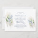 Beautiful hand painted watercolor eucalyptus branches and leaves, created in a range of earthy, natural greens and dusty blues. Your wedding details were created with decorative fonts, typeset in a complimentary shade of blue. The back has a blue hued wood background. The finished result is a delicate, but vibrant wedding invitation your guests will be delighted to receive and respond to.