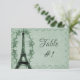 Number your reception tables with a Green Eiffel Tower reception table card. Table card design features the Eiffel Tower adorned with a fancy flourish frame against a grunge background and postal stamp embellishment. Additional wedding stationery available with this design as well. Need help with customization? Please contact me and I will work out the wording and details to fit this design to your satisfaction.