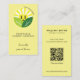 A solar-themed business card for your renewable energy company. An original Mango Moon Studio illustration of an abstract sunflower and sunrays, incorporating them as an electric plug adorned with green leaves. The front side includes space for your own tagline (Harness the power of the sun), while the reverse side displays your contact information and a QR code. Kindly ensure QR code address is updated accordingly.
