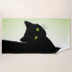 Sly black cat with emerald green eyes looks out from behind black wall into a green room.
