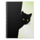 Sly black cat with emerald green eyes looks out from behind black wall into a green room.