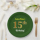 Green, Faux Gold 15th Birthday + Custom Name Paper Plate