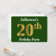 This invitation design features the ordinal number "20th" with a faux gold-like appearance. It also features a customized name, and a green coloured background. The event details on the back can be personalized. It could be used to invite people to somebody’s twentieth birthday party. [~Z0000013]