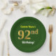 Green, Faux Gold 92nd Birthday + Custom Name Paper Plate