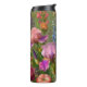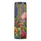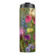 Vibrant Floral Travel Mug With Colorful Iris, Delphinium And Petal Design On Green Background