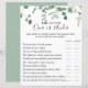 This green foliage over or under baby shower game is the perfect fun activity for a simple baby shower. The design features watercolor hand-drawn elegant botanical eucalyptus branches and leaves, arranged in beautiful bouquets and geometric patterns.