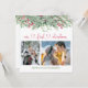 Our First Christmas Photo Card. This design features a watercolor illustrations of greenery foliage and red berries. Text "our first christmas" is written in calligraphic style. Place your photos below to complete.