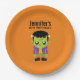 Halloween birthday paper plates with a fun Halloween image featuring a green Frankenstein monster.