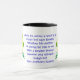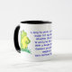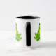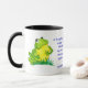 A white ringer mug with a black rim and handle and a green frog front and back, from a watercolour illustration by Judy Adamson. Between the two frogs is the first verse of the Nursery Rhyme, 'A frog he would a-wooing go..' in blue lettering.