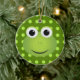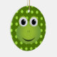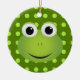 This frog ornament is perfect for any frog lover! It features a design of a cute green cartoon frog with a big smile. The frog is on a dark green background with light green polka-dots.