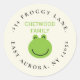 Custom Frog round return address labels template. Customize with your family's name and mailing address. Click the 'personalize' button to further customize the design if you need to shrink or increase the font size, curvature, or move items. Need help? Please send us a message (before ordering), and we can add your details and send a link to purchase.
