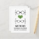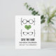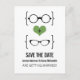Lunettes Geeky Quirky et chic Save the Date Carte postale avec un coeur vert flanqué de deux paires de lunettes geeky, une paire de manies et une paire de ceintures représentant le marié et la mariée. Cette carte postale décalée mais sophistiquée sauve la date est parfaite pour annoncer votre mariage nerveux! Facile à customiser, il suffit d'ajouter les détails de votre mariage dans les espaces prévus. Cliquez sur le bouton "Customiser" pour trouver d'autres options de personnalisation.