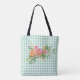 All over print tote bag done in a mint green and white gingham checked pattern, with watercolor graphics of a colourful peony floral bouquet. Customize to add your own text to this pretty all purpose bag.