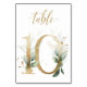 Beautiful table number card with a botanical motif - a watercolor illustration of green and gold leaves.