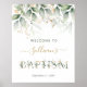 Greenery Welcome to Baptism sign - this design features a watercolor illustration of green and gold foliage.