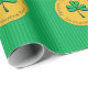 This festive Happy St. Patrick's Day wrapping paper features a green-on-green thin striped pattern with circular gold frames featuring a hand-drawn lucky clover and 2 custom texts: Title and Name. Perfect St. Patrick's Day gift wrap for all ages.