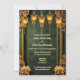 A beautiful brocade floral background in a deep forest green is framed by an ornate golden frame that has two golden Indian elephants on the bottom corners. Five glowing lanterns hang from the top edge and delicate vertical border lines appear on the sides. This Hindi inspired design has white templates on it for your custom wording and the back has an additional template for further details to guests and family which may be removed if not required. The warm tones give this design a luxurious, elegant and upmarket feel. This invitation is ideal to celebrate any Hindu ceremony or any ethnic Asian celebration or wedding.