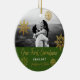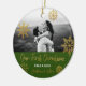 Bright Christmas holiday photo ornament with gold snowflakes and bright green background for engaged couple. Personalize it by adding your names. It's a good gift for newly weds or for a fiance/fiiancee.