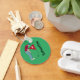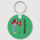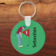 Green personalised golfer, wearing a cap, deep red shirt and blue pants, putting a golf ball into a hole button key ring. Customise the text.