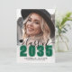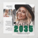 Classic Modern Graduation Announcement. The front features a full-page photo with a white gradient at the bottom that fades seamlessly into the image. Over the gradient, "2026" appears in a bold emerald green or forest green classic school-style font. Just above it, "Class of" is written in elegant black script. To the left of the year is a small, customizable graduation cap icon. Below the year, the graduate's name and school name are prominently displayed. All colors can be customized to match school colors or personal preferences.