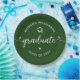 Be proud, rejoice and showcase this milestone of your favorite grad! Celebrate with these simple, modern, bold custom paper plates. Fun white handwritten calligraphy script with cute, playful hearts and a graduation cap icon overlay a hunter green background. Personalize the custom text with your graduate’s name and class year or special message. Available in 2 sizes: 7” or 9”, round or square. Matching invites, thank you cards, hand fans, banners, yard signs and other graduation goodies are also available in this trendy and playful collection. Guaranteed to add stylish fun to their special party!