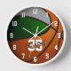 This personalized basketball wall clock features the realistic image of a basketball that has two recolored panels--one green and one grey--with overlying clock face numerals - personalize with player name in an "autograph" style font overlying the athlete's jersey number - by katz_d_zynes