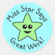 Une star de caricature joyeuse et verte. Le texte dit "Miss Star dit Super Travail !" et peut être modifié pour un nom/message personnalisé. Idéal pour les enseignants comme récompenses pour les étudiants.