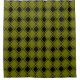 This shower curtain has a mid-century modern design of solid black diamonds inside black diamond outlines on a field of green.
