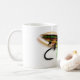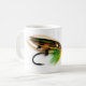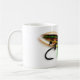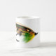 A plain white mug with the beautiful salmon fishing fly Green Highlander in stunning detail