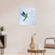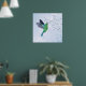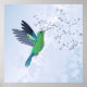 A cute green hummingbird with blue cherry blossoms on a blue floral shimmering background. Elegant nature design.