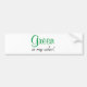 Green Is My Colour saying bumper sticker. Cute design stating your favourite colour. Text is "Green is my colour!" in a pretty typography mix.The word Green is in a green handwriting style. The words "is my colour" is in a fun italic text style.