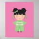 Sweet Japanese doll illustration features girl doll in pink floral kimono with traditional hair decor. Perfect wall art for nursery or kids room.