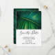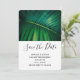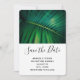 Wedding save the date card with a closeup photo of a green tropical leaf displaying some vibrant palm fronds.