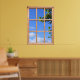 For a touch of summer days all year round, this faux window shows a blue sky with fluffy white clouds and the sunlit leaves of a tree. A soothing scene to look out on in harsher seasons. The fake frame gives this photographic poster the look of a real window. Now you can enjoy summertime at any time of year!
