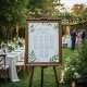 Wedding seating chart with elegant script for the names and a green leaves geometric decoration. The chart says "Welcome Please Find Your Seat" there are spaces for 10 tables and your guests names. Each table number is in a leaf green colour.