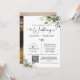 This invitation features an elegant, stunning, and watercolor eucalyptus greenery leaves arrangement with an elegant calligraphy script wording "the wedding of". Please note: On the front, the wording of "the wedding of" and "reception to follow", the watercolor eucalyptus greenery leaves bouquet arrangement, the lines, and other graphic artwork elements cannot be deleted, edited, or changed. It's easy to customize this wedding invitation -- just personalize the text wording and replace the photo and QR code with yours.