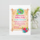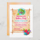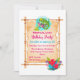 A birthday party invite with a tropical luau theme. Designed with with a cute illustration of a green tropical lizard surrounded by exotic leaves and flowers. A bamboo style frame holds all your party info.