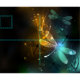 Flight of glowing, green, artistically drawn dragonfly with transparent green and yellow wings on glowing night background with marsh plants and fireflies. Glowing dragonfly.