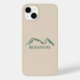 A light brown phone case with green mountains and personalized text. A nice gift idea for lovers of hiking & outdoor adventures!