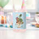 A small green dragon sitting on one of threee mushrooms with flowers all around in a backdrop of blue