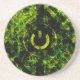 Green neon fire swirling design. Swirls of glowing green neon fire with a power symbol (IEC 5009 symbol) in the centre. Over black. Geek nerd coaster for the man cave or LAN party.